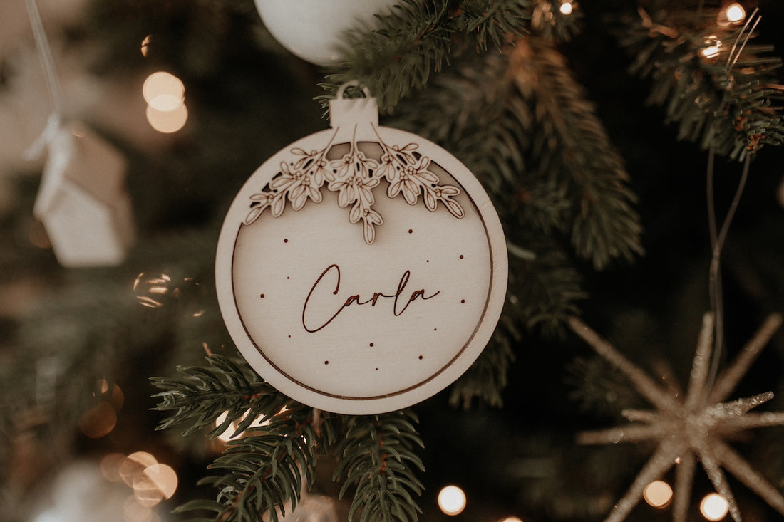 Nachhaltige Weihnachtskugel aus Holz personalisiert mit Namen. Ein perfektes Geschenk für eure Liebsten zu Weihnachten...