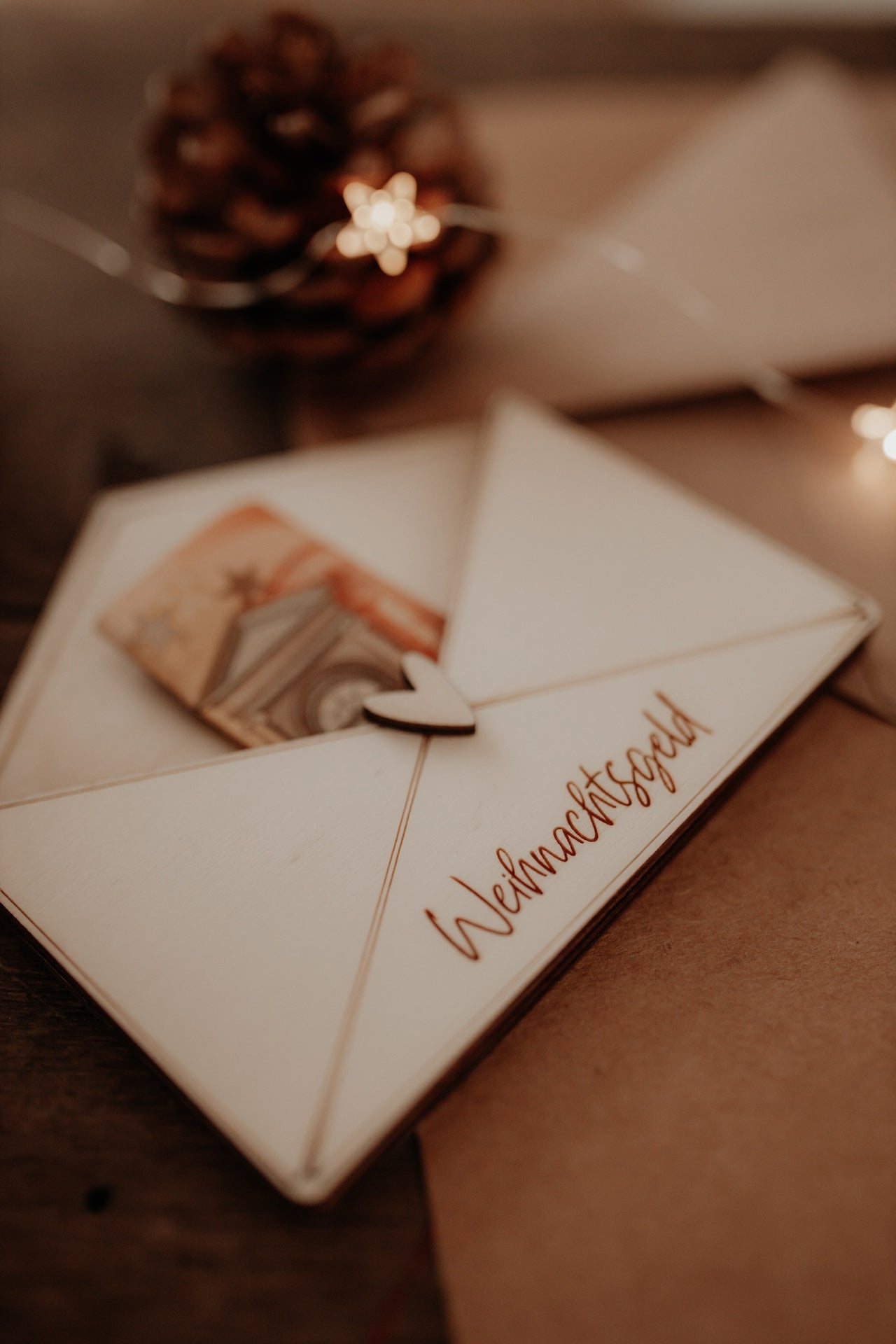 Der stabile Umschlag aus hochwertigem Holz trägt die festliche Gravur „Weihnachtsgeld“ und verleiht deinem Präsent eine warme, persönliche Note. Durch die clevere Konstruktion aus drei passgenau verklebten Teilen lässt sich das Geld sicher und stilvoll hineinstecken – ohne dass es verrutscht.