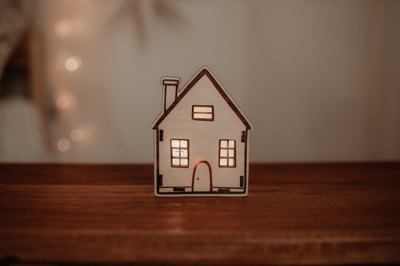 Die Häuser werden aus mehreren Holzteilen zusammengesteckt und sind mit einer Lichterkette mit 10 warmweißen LEDs ausgestattet. Die passenden Batterien (3x LR44) sind bereits enthalten – du kannst dein Lichterhaus also sofort erstrahlen lassen.