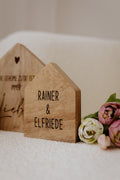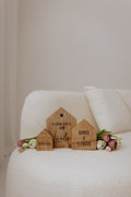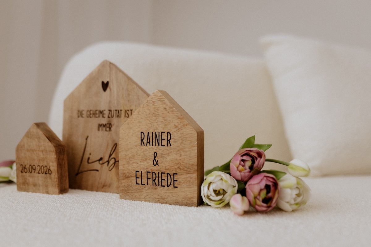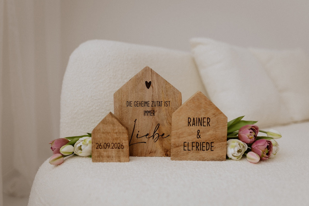 Entdecke unser charmantes Dreier-Set aus Mango-Holzhäusern, das mit Hingabe und Liebe gefertigt wurde. Diese bezaubernden Häuser sind nicht nur ein dekorativer Blickfang, sondern tragen auch eine persönliche Note: Auf dem mittleren Haus kannst du zwei Namen gravieren lassen, während das kleine Haus Platz für ein bedeutendes Datum bietet.