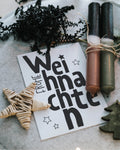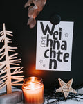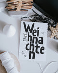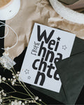 Diese Postkarte setzt „Frohe Weihnachten“ typografisch perfekt in Szene. Die klare Schrift steht im Mittelpunkt, begleitet von drei kleinen Sternen, die dem Design einen feinen, festlichen Akzent geben. Kein Kitsch, kein Übermaß – nur ein stilvolles Zusammenspiel aus Form, Schrift und Symbolik. Ideal für alle, die Ästhetik lieben und mit einem reduzierten, modernen Gruß Freude schenken möchten.