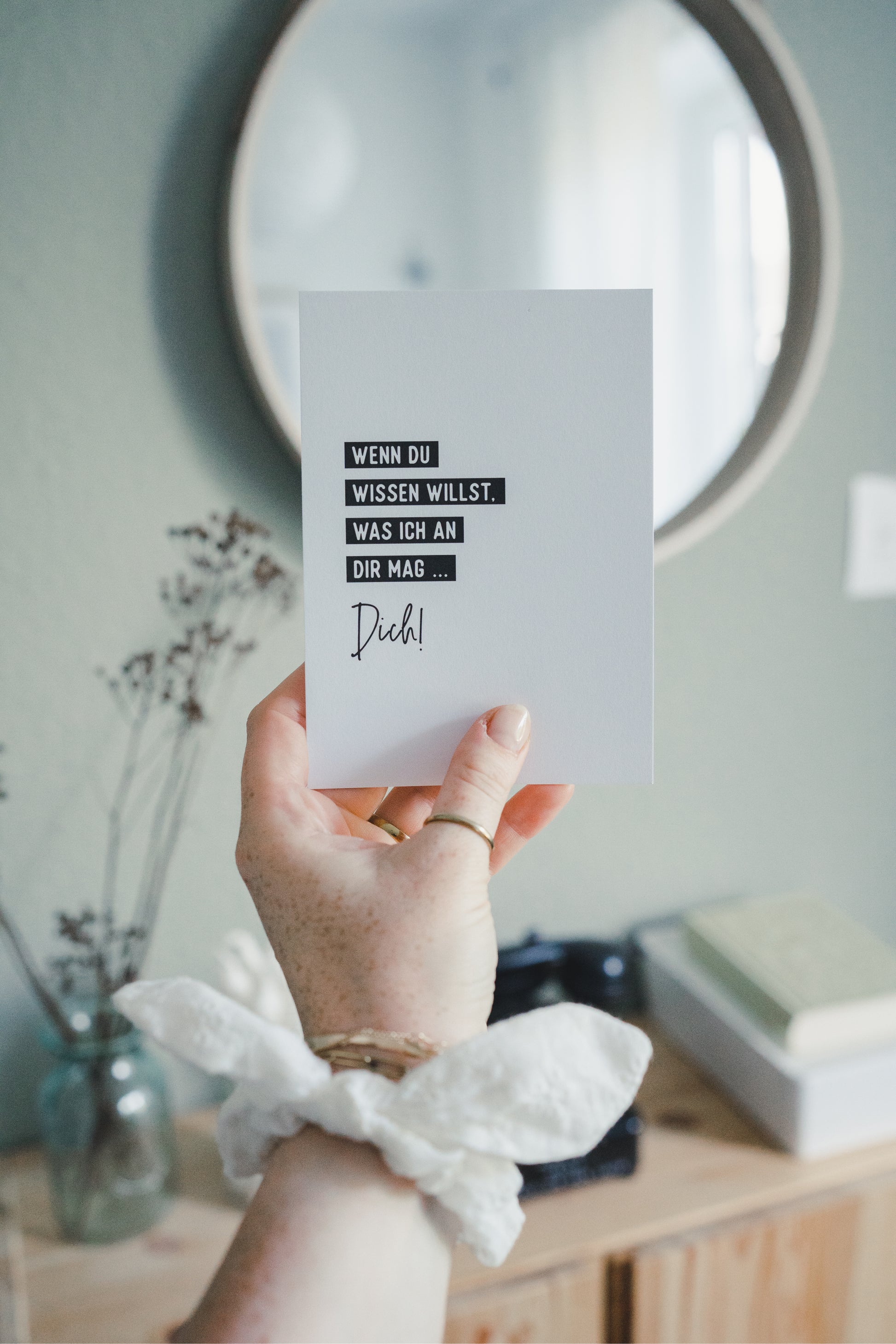 Unsere stilvolle Postkarte "Wenn du wissen willst, was ich an dir mag: dich" ist die perfekte Art, jemandem zu zeigen, wie sehr du ihn schätzt. Ideal für besondere Momente oder einfach nur so, um jemandem ein Lächeln ins Gesicht zu zaubern.