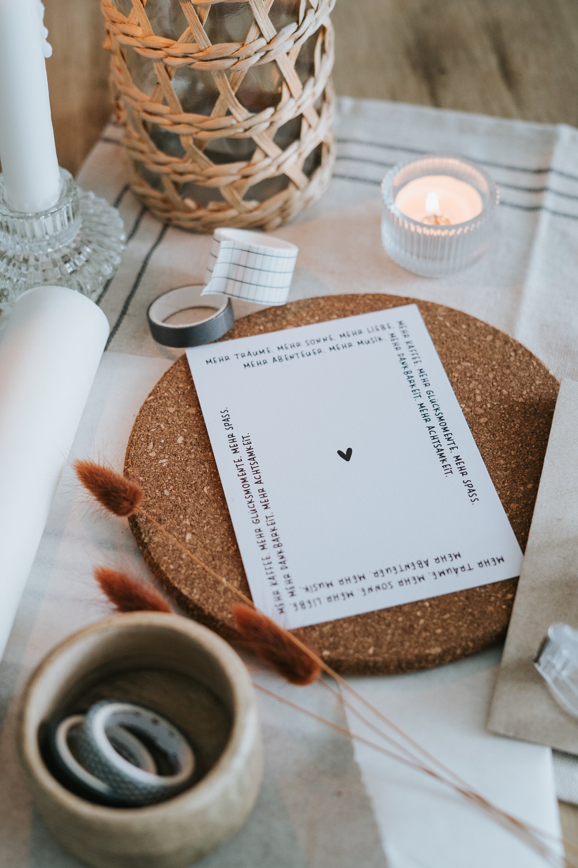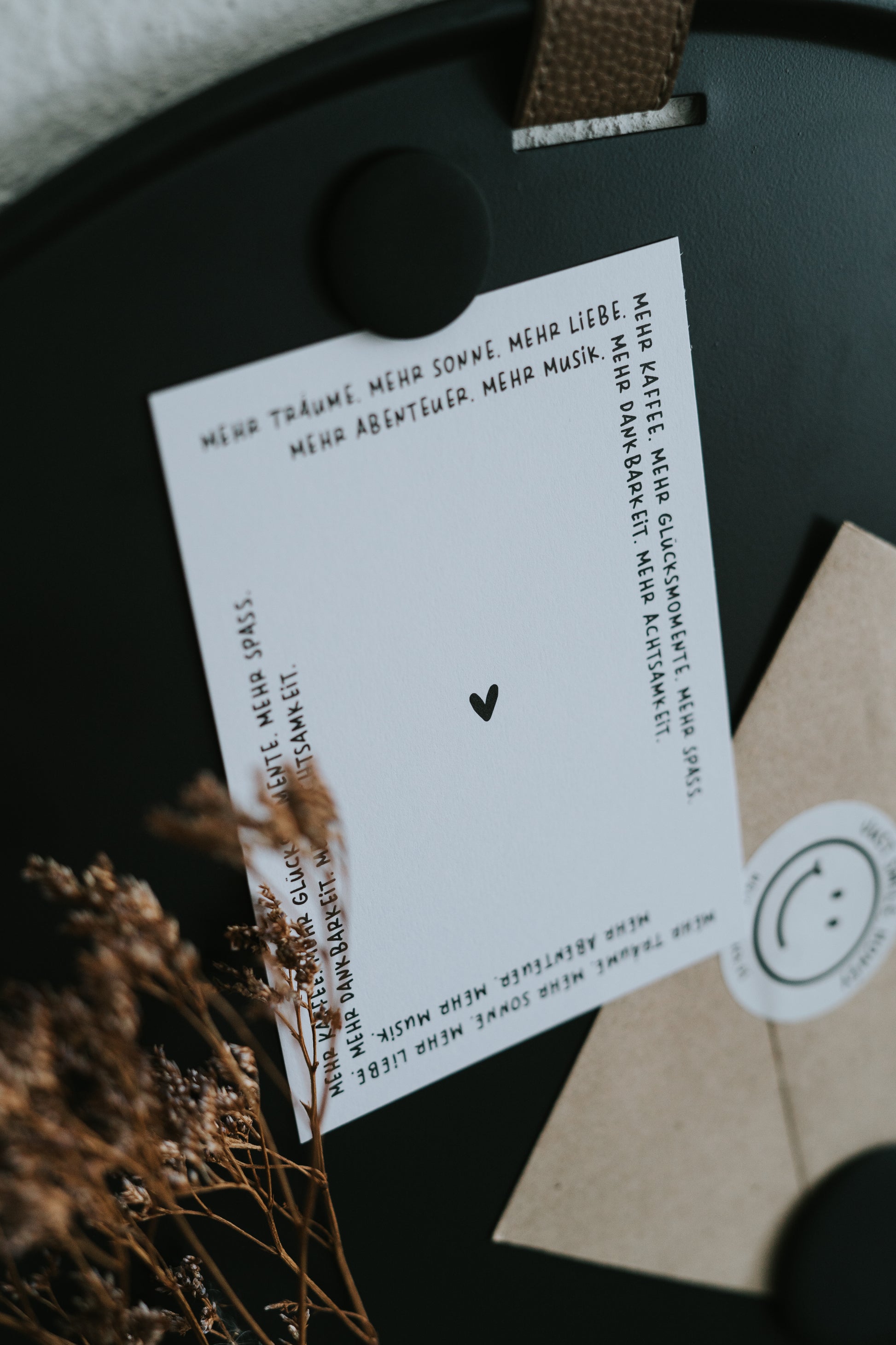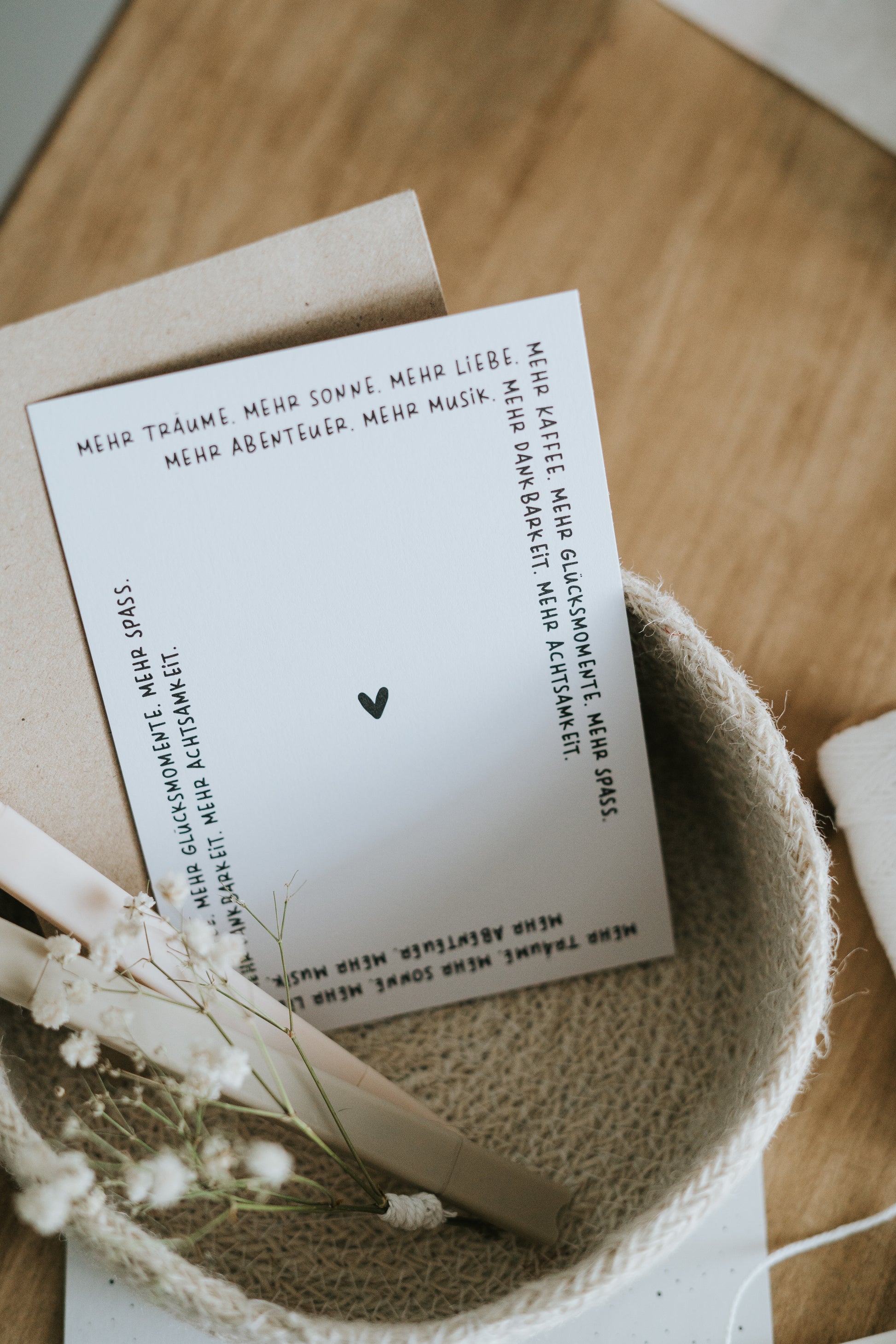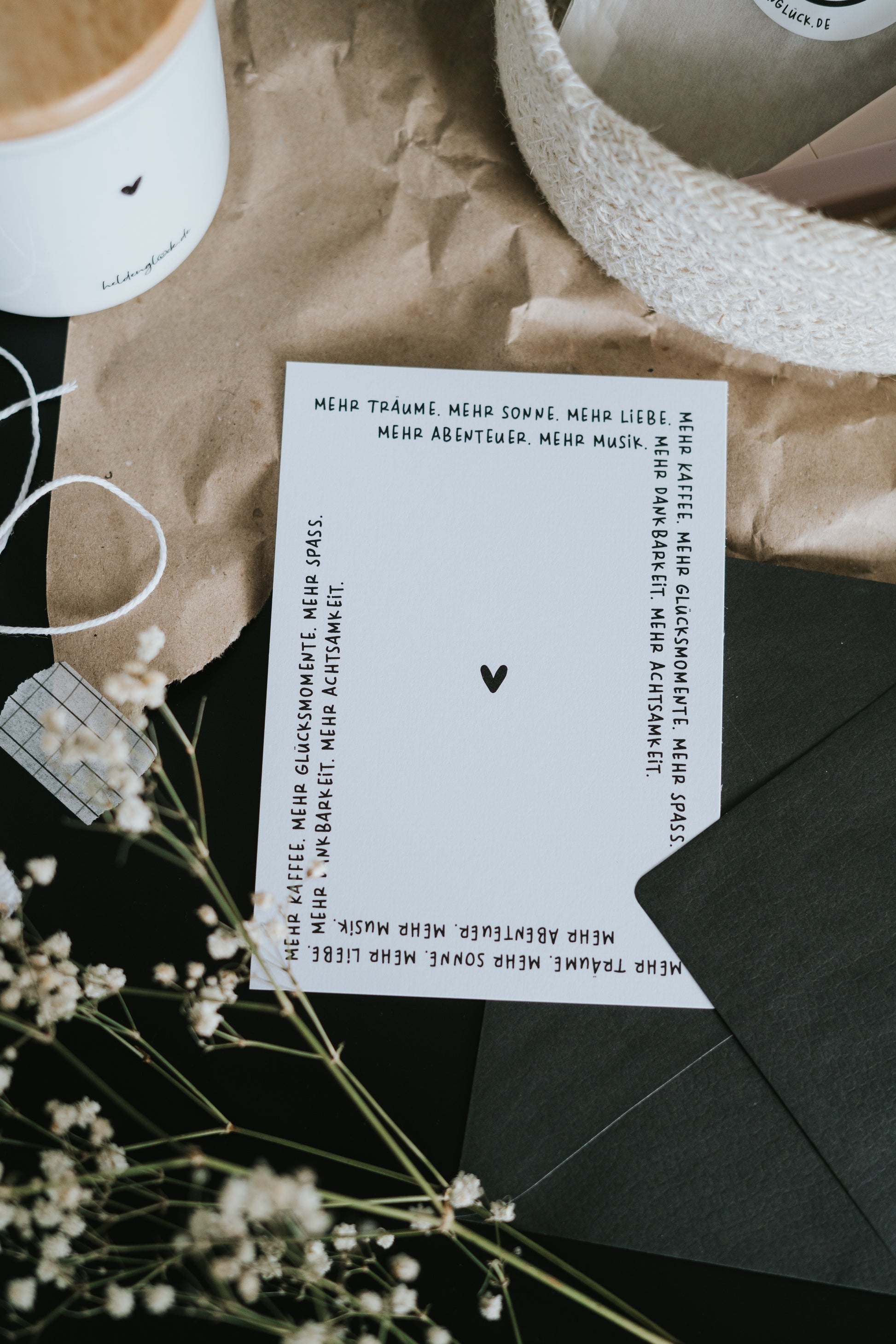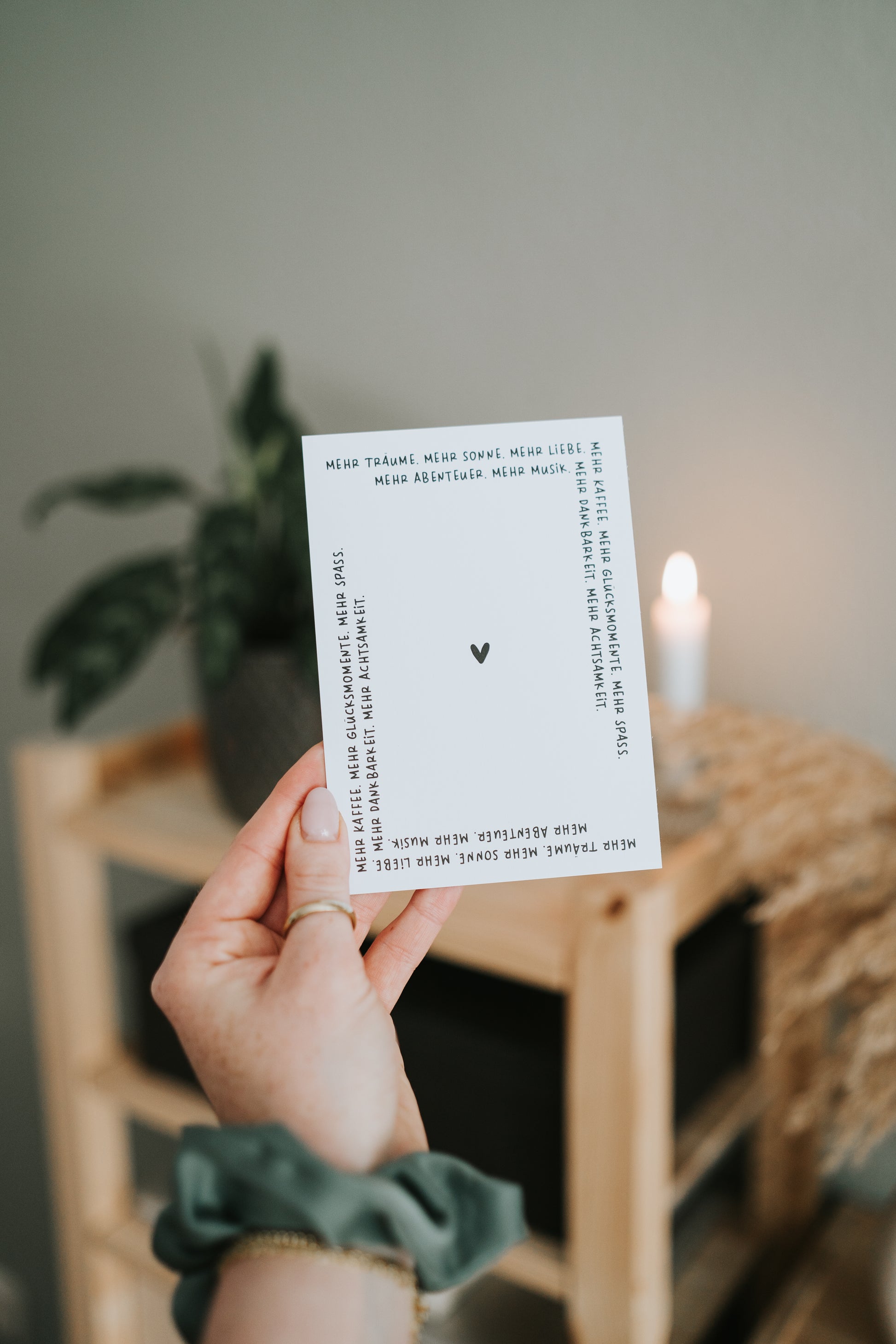 Unsere stilvolle Postkarte mit dem Spruch "Mehr Träume, mehr Sonne, mehr Liebe" ist das perfekte Geschenk, um positive Energie und gute Wünsche zu verbreiten.