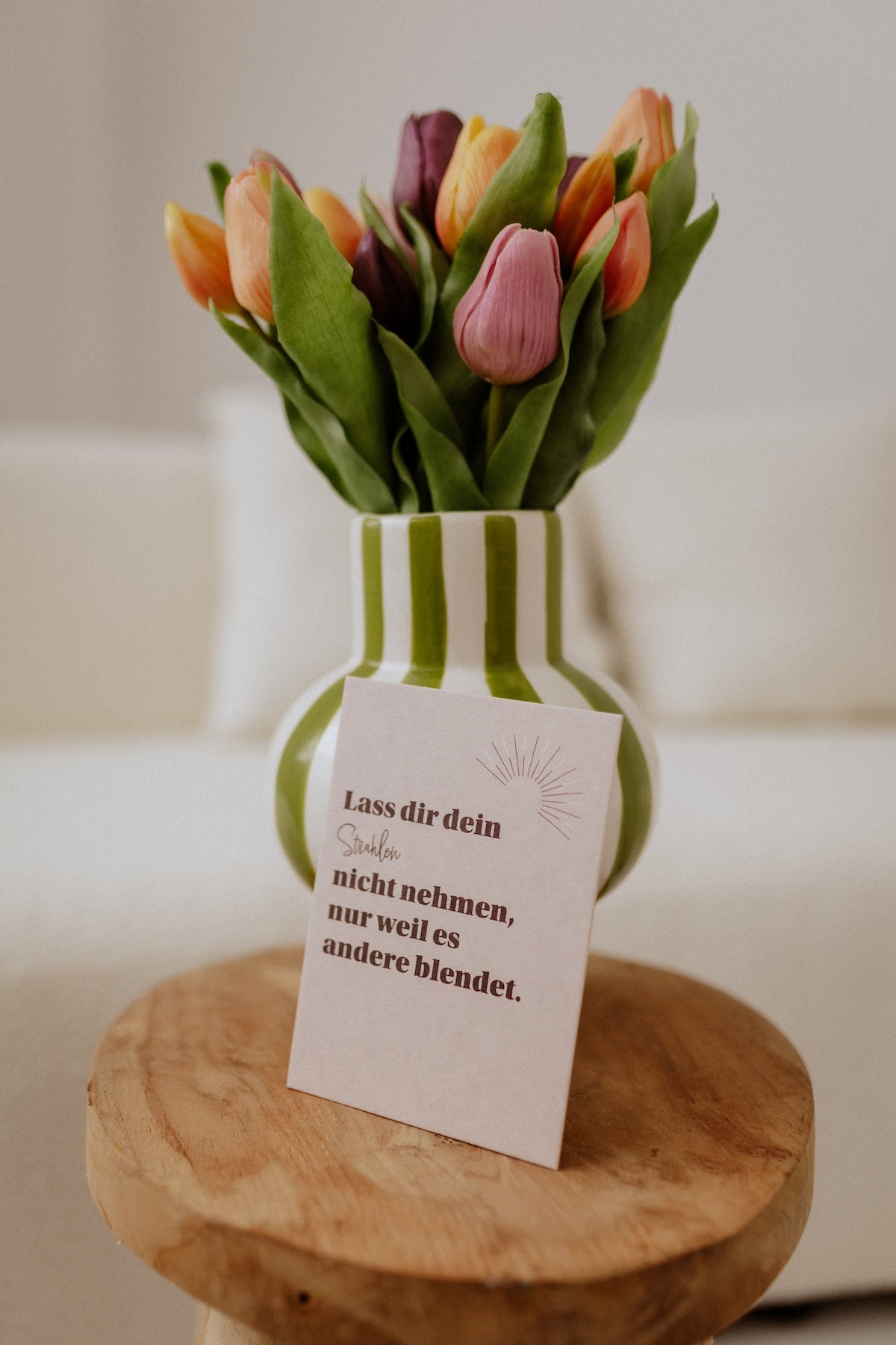 Entdecke unsere inspirierende Karte „Strahlen“ – die perfekte Postkarte für innere Stärke und Lebensfreude. Mit einem spannenden Design und einer aufmunternden Botschaft spricht sie eine breite Zielgruppe an und eignet sich hervorragend für verschiedene Anlässe, sei es als Geschenk oder für die persönliche Notiz.