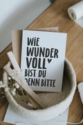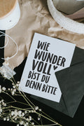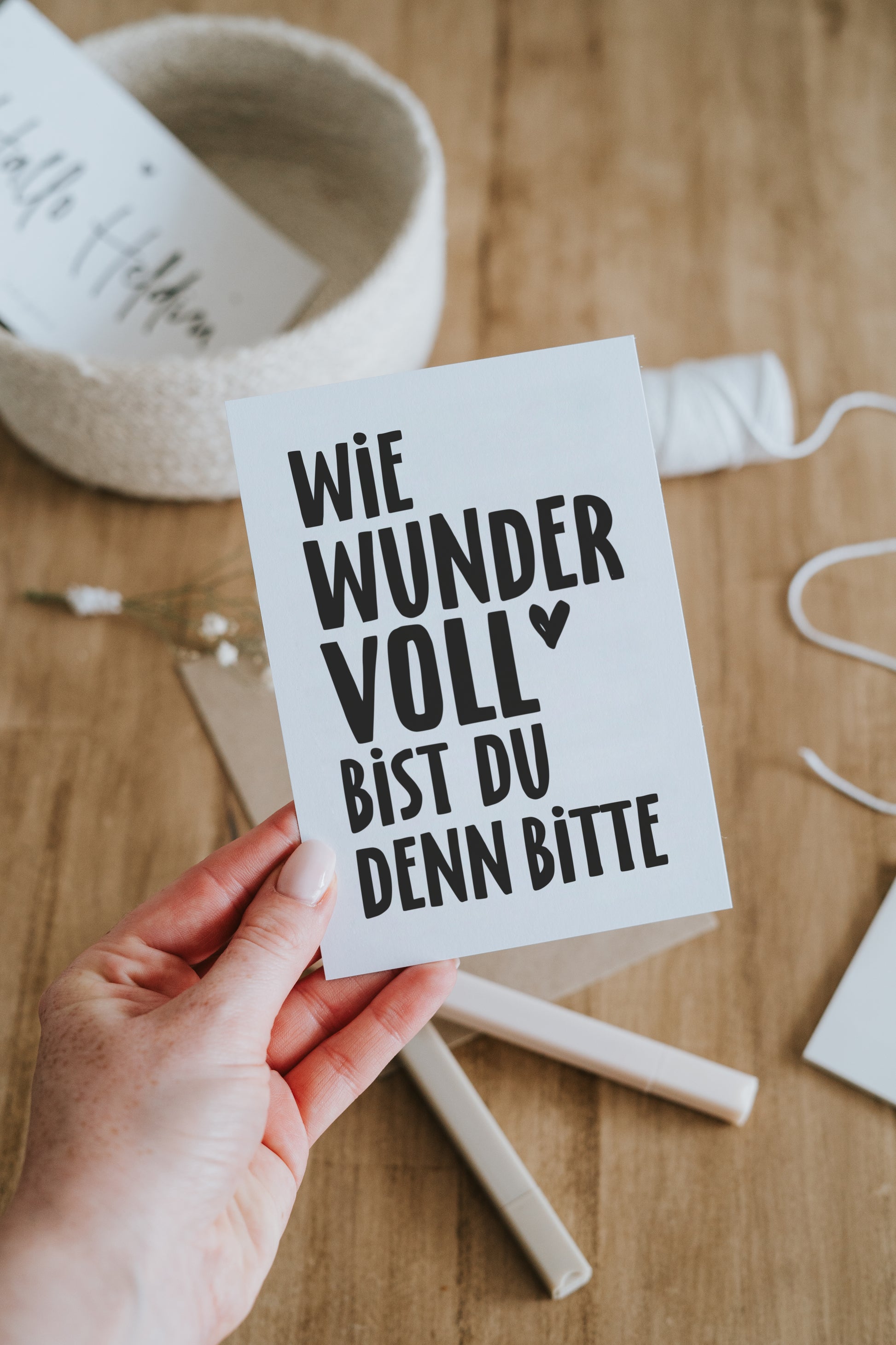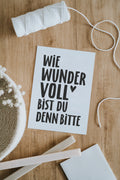 Unsere stilvolle Postkarte mit dem liebevollen Spruch "Wie wundervoll bist du denn bitte" ist die perfekte Möglichkeit, einem besonderen Menschen ein Kompliment zu machen – und dabei garantiert ein Lächeln zu zaubern.
