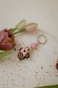 Setze ein farbenfrohes Statement mit unserem Schlüsselanhänger "Mickey Mouse"! Dieser auffällige Schlüsselanhänger vereint fünf bezaubernde Perlen, darunter eine schützende Sicherheitsperle, eine fröhliche Silikonperle in lebhaftem Flamingo Pink und eine elegante Holzperle, die mit deinem Namen graviert werden kann – perfekt für eine persönliche Note.