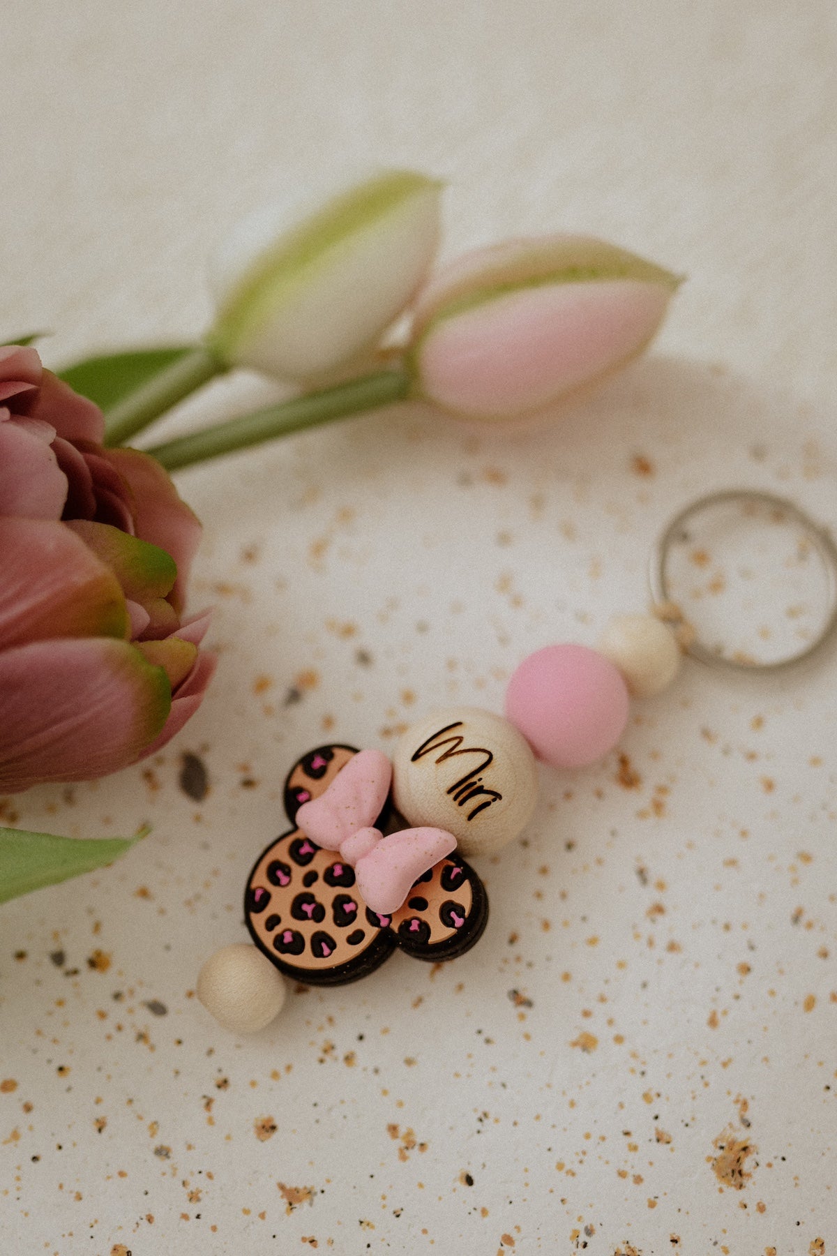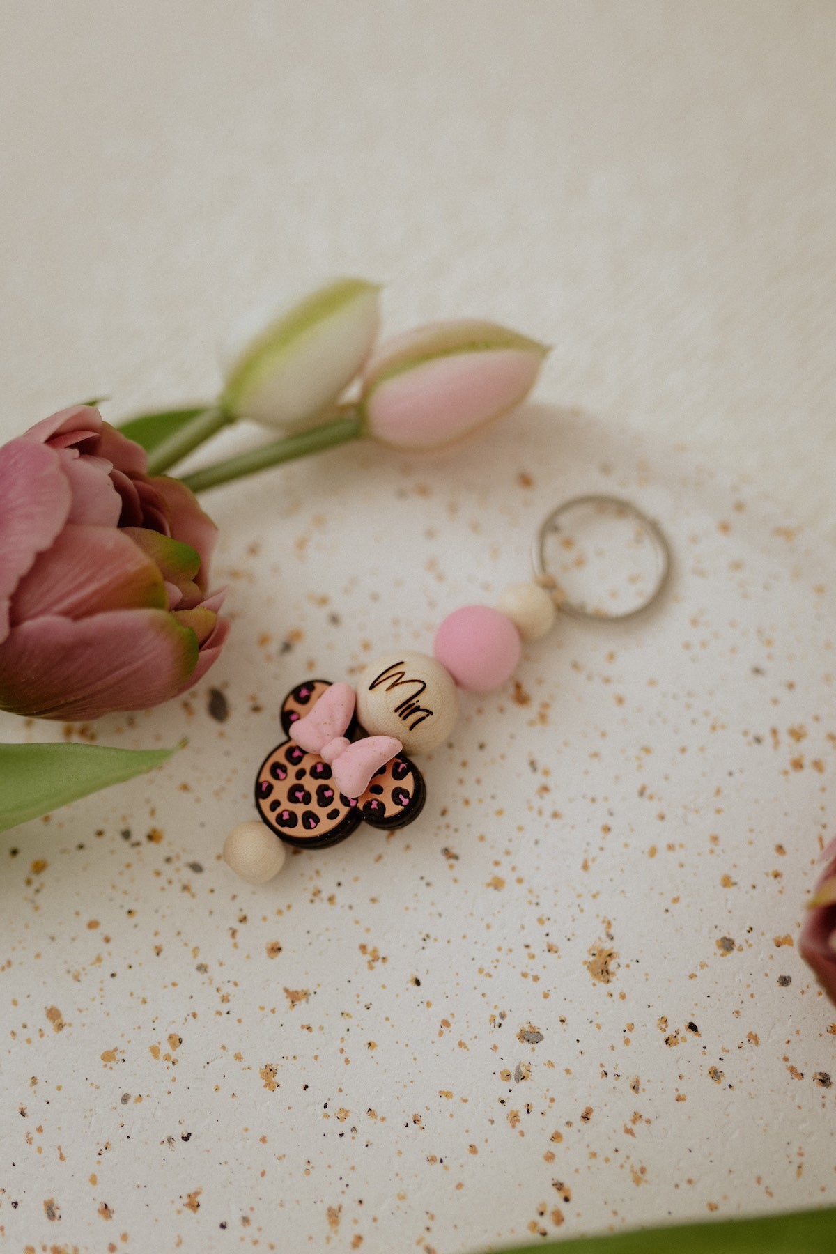 Ein besonderes Highlight ist die originelle Micky-Maus-Perle im trendigen Leopardenmuster, die dem Schlüsselanhänger einen verspielten und einzigartigen Touch verleiht. Abgerundet wird das Design durch eine weitere Sicherheitsperle.