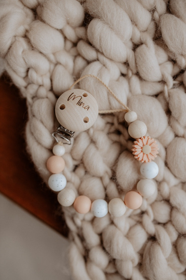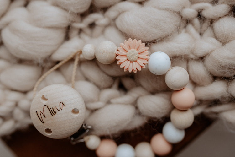 Mach jeden Moment noch süßer mit unserer Schnullerkette „Mina“! Sie besteht aus hochwertigen Ahornholz- und Silikonperlen und sorgt nicht nur für Sicherheit, sondern auch für einen echten Hingucker. Besonders persönlich: Der Clip kann mit dem Namen deines Babys versehen werden – bitte unbedingt bei der Bestellung angeben.