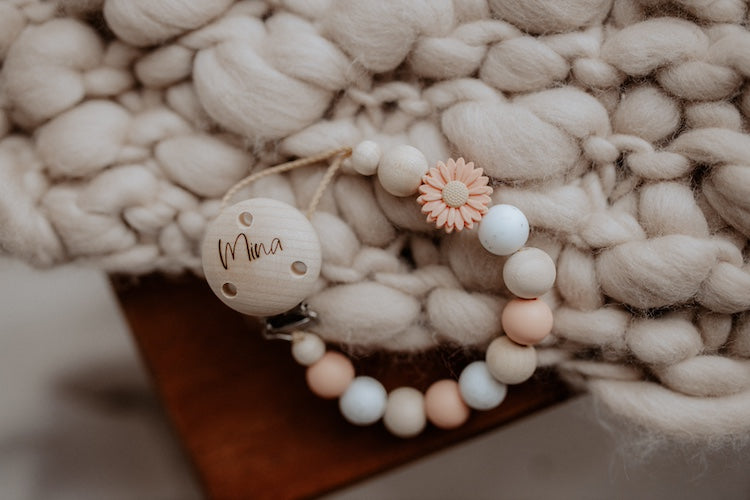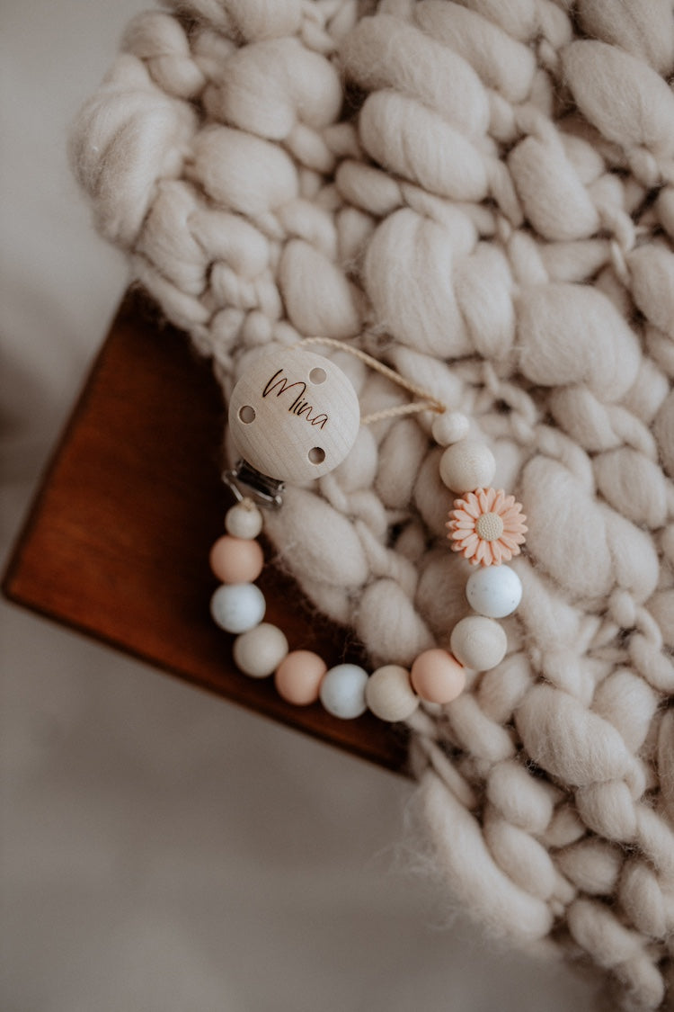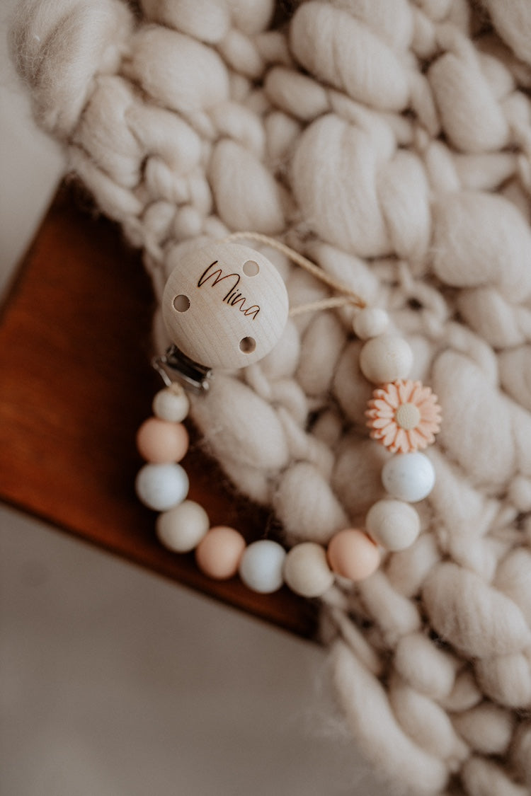 Gestalte die Schnullerkette „Mina“ individuell und verschenke ein praktisches und zauberhaftes Accessoire, das jedes Baby strahlen lässt!