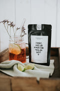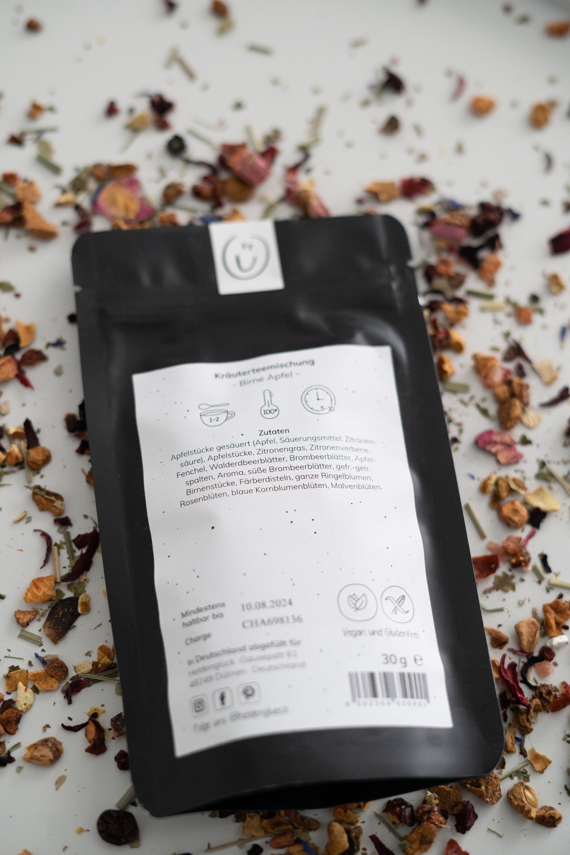 Zutaten: Apfelstücke gesäuert (Apfel, Säuerungsmittel: Zitronensäure), Apfelstücke, Zitronengras, Zitronenverbene, Fenchel, Walderdbeerblätter, Brombeerblätter, Apfel-spalten, Aroma, süße Brombeerblätter, gefr.-getr. Birnenstücke, Färberdisteln, ganze Ringelblumen, Rosenblüten, blaue Kornblumenblüten, Malvenblüten.