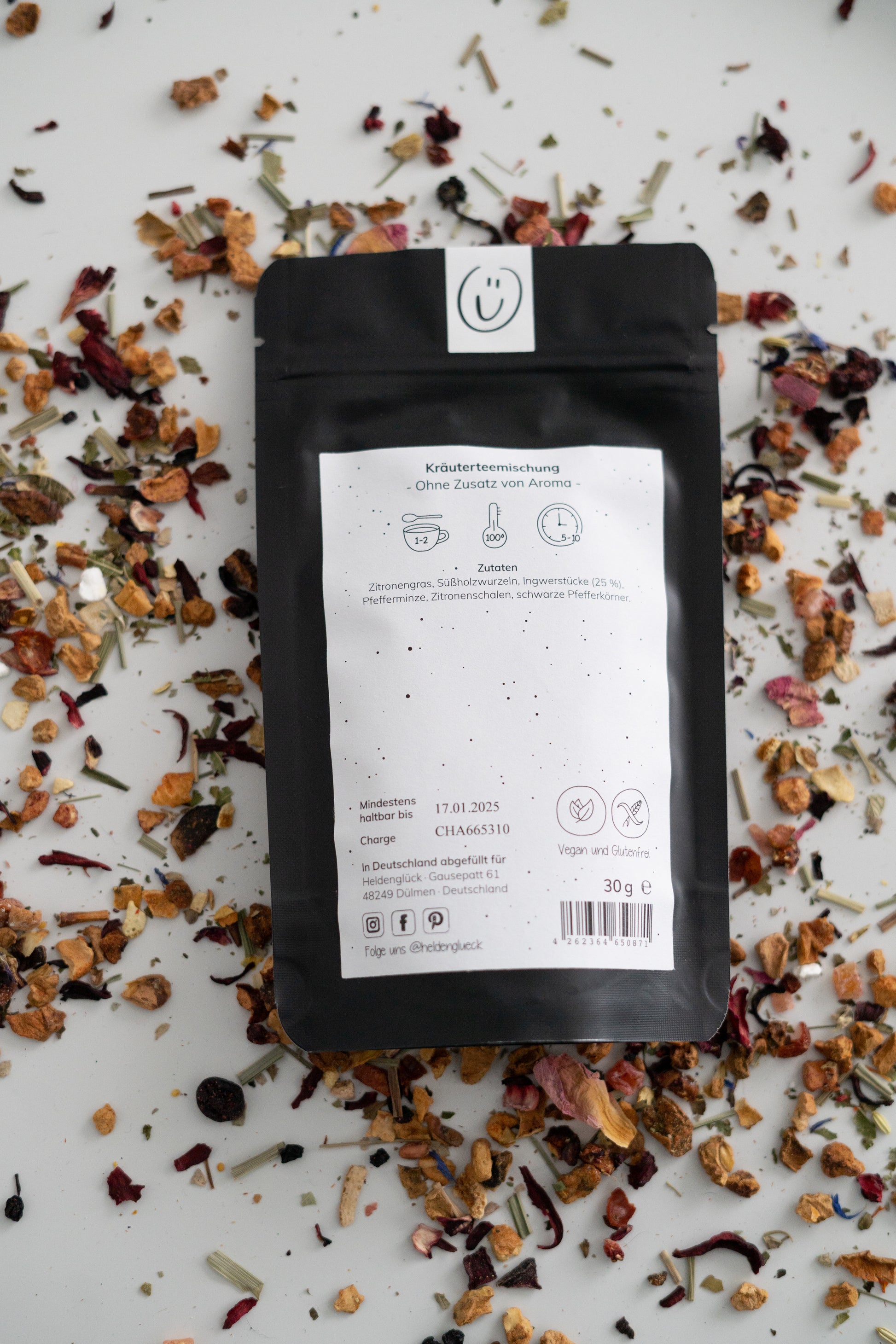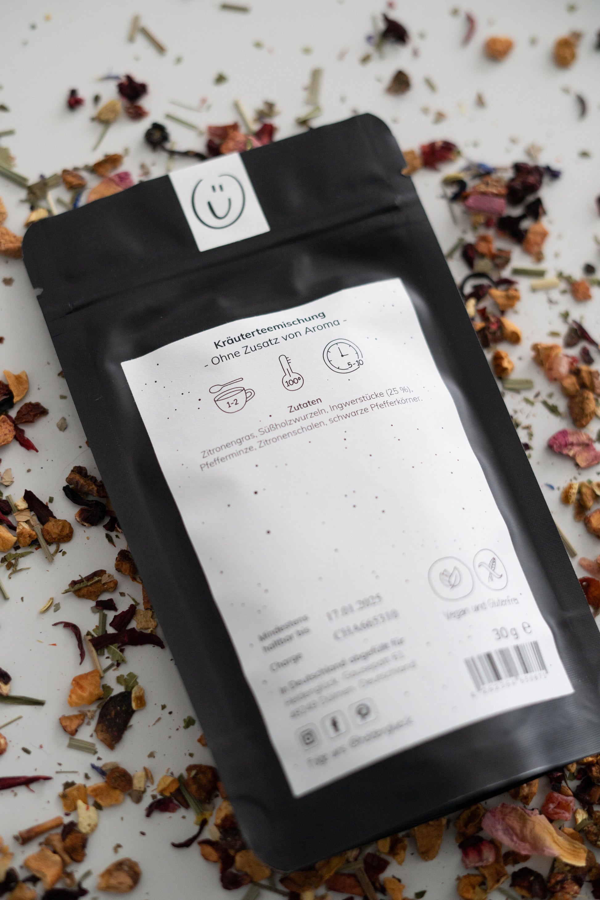 Natürliche Zutaten: Eine harmonische Mischung aus Zitronengras, Ingwer, Süßholzwurzel, Pfefferminze, Zitronenschalen und schwarzem Pfeffer – ganz ohne künstliche Zusätze.