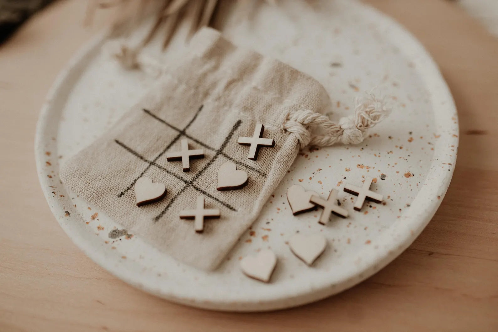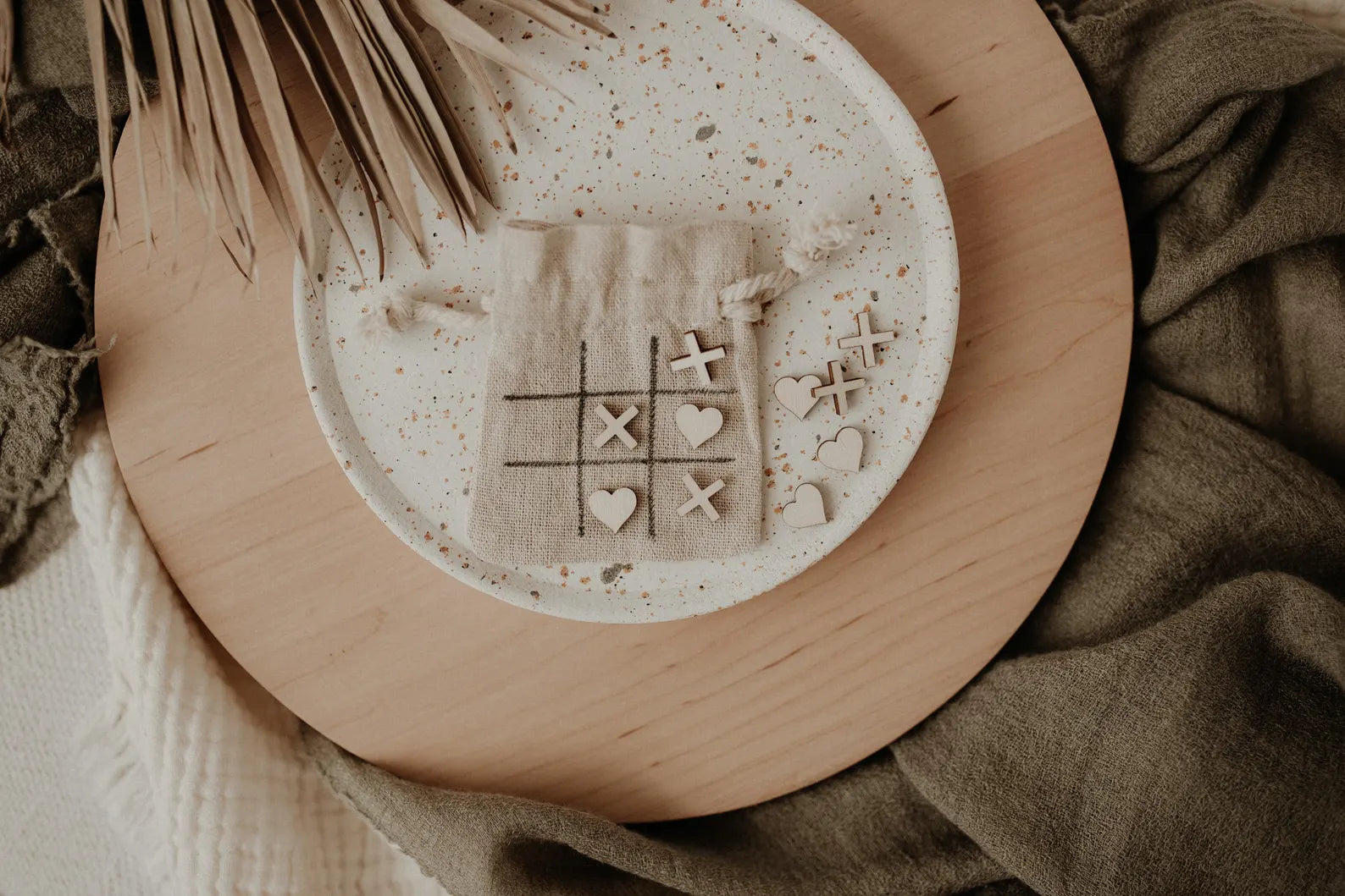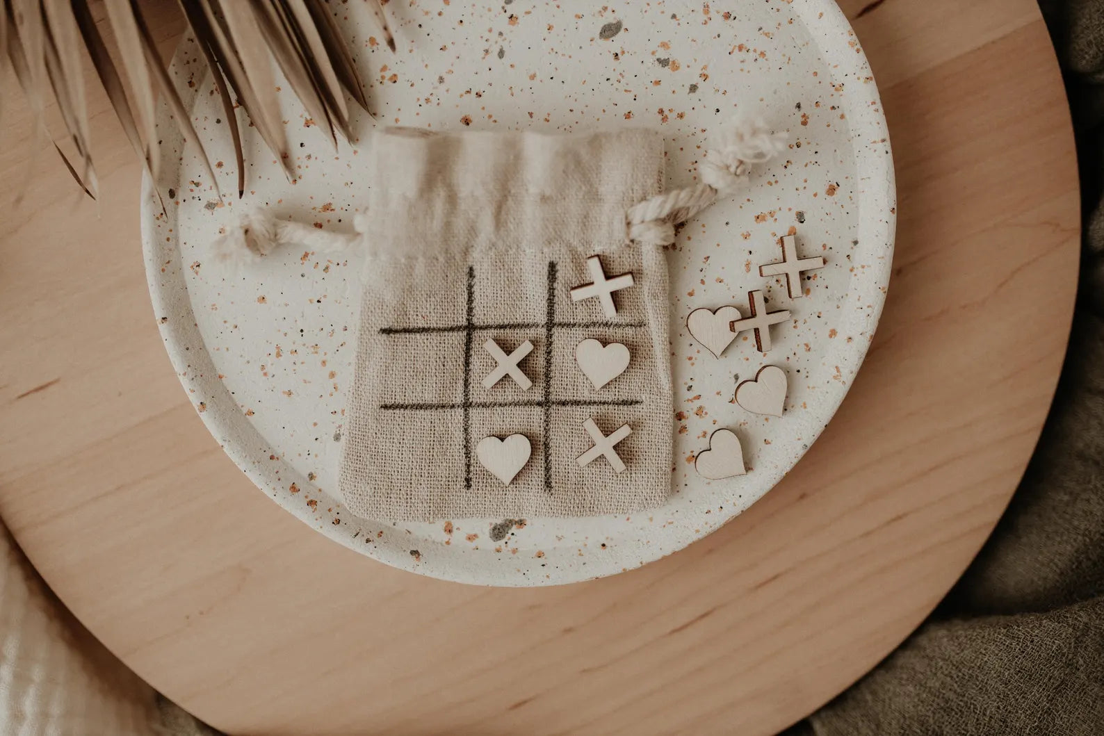 Entdecke unser charmantes Mini Tic Tac Toe Spiel – der ideale Begleiter für unterwegs! Dieses handliche Spiel kommt in einem schicken Säckchen, das nicht nur als praktischer Aufbewahrungsort dient, sondern gleichzeitig auch als Spielfeld fungiert. Mit fünf robusten Holzkreuzen und fünf filigranen Holzherzen (jeweils 3 mm stark) kann man jederzeit und überall ein spannendes Spiel genießen.
